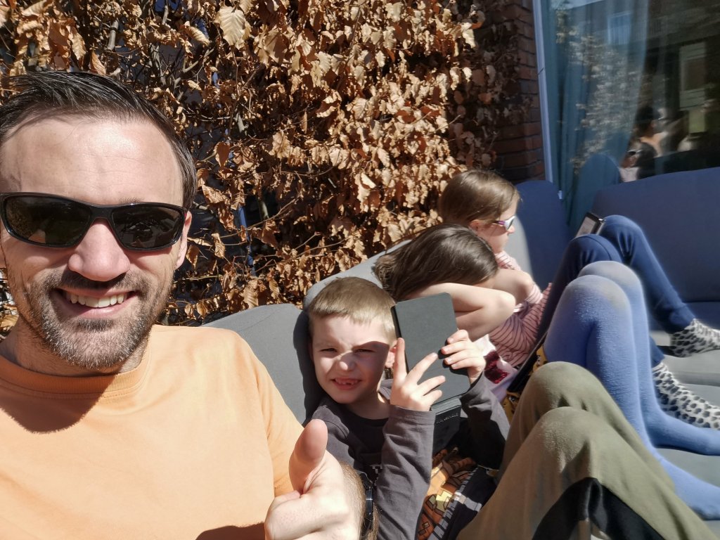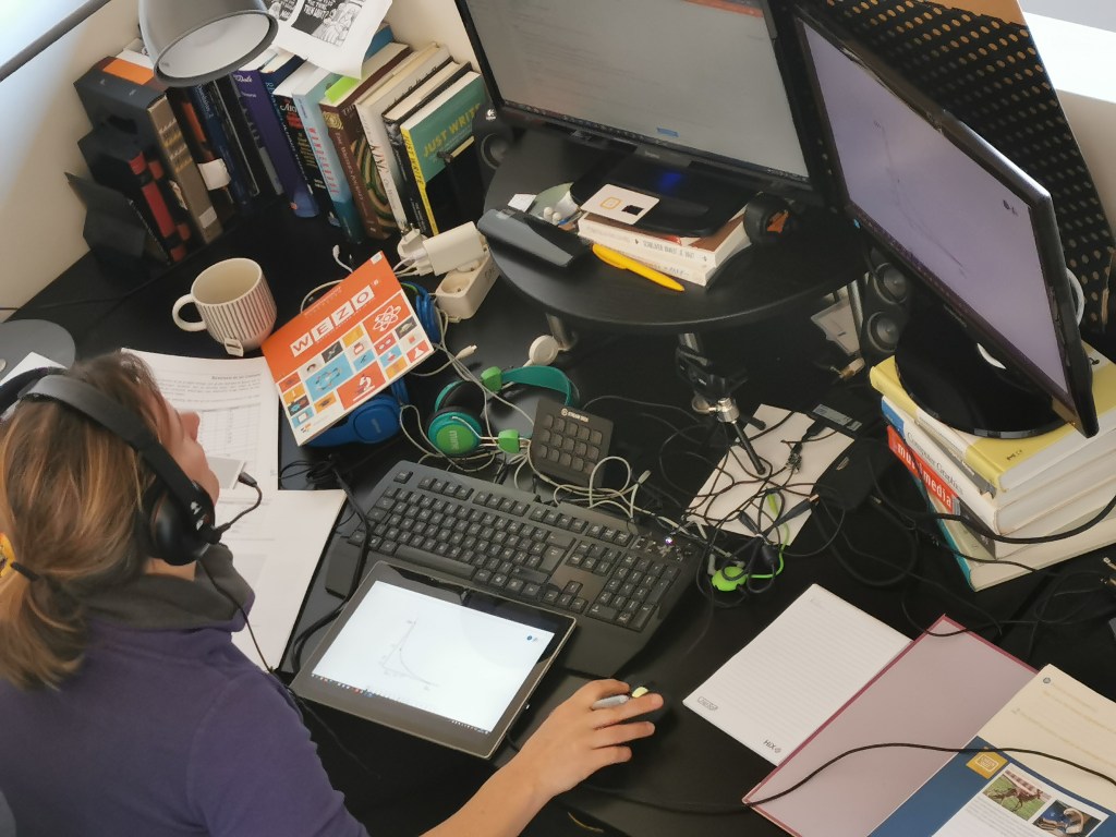 Vandaag bewust wat vertraagd wanneer mogelijk. Onder andere uurtje in’t zonneke aan boek gewerkt terwijl de kids met hun klasgenootjes video-belden en Sara de salontafel inpalmde met haar kaften van Chemie.