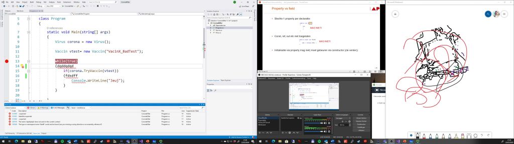In deze nieuwe manier van lesgeven waarbij ik misschien iets over-the-top ga qua opstelling is er nu een nieuw fenomeen opgedoken. Het oplossen van problemen bij aanvang van een live les. “In den ouwen tijd” was dat een kwestie van uw overhead-transparant omdraaien omdat ge het weer gespiegeld had gelegd (confession: nooit zo les gegeven, wel pa dat vaak zien maken en zelf in middelbare studies af en toe zo presentatie moeten geven). Bij een live streaming les zijn er iets meer mogelijkheden waar er problemen kunnen optreden. Het gevaar is echter een soort cascade van nieuwe problemen te veroorzaken wanneer je de oplossing op een verkeerde plek zoekt.