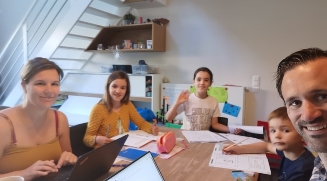 Ons leven de komende weekdagen 🙂 We zitten uiteraard niet altijd samen rond de tafel. Soms verdwijnt er iemand naar een aparte kamer om een videoles te volgen/geven of te vergaderen. De voormiddag ging vlot. De juffen van de kids hadden zich erg goed voorbereid, hadden tal van clips opgenomen en maakten gebruikt van Google Classroom of iets dergelijks.