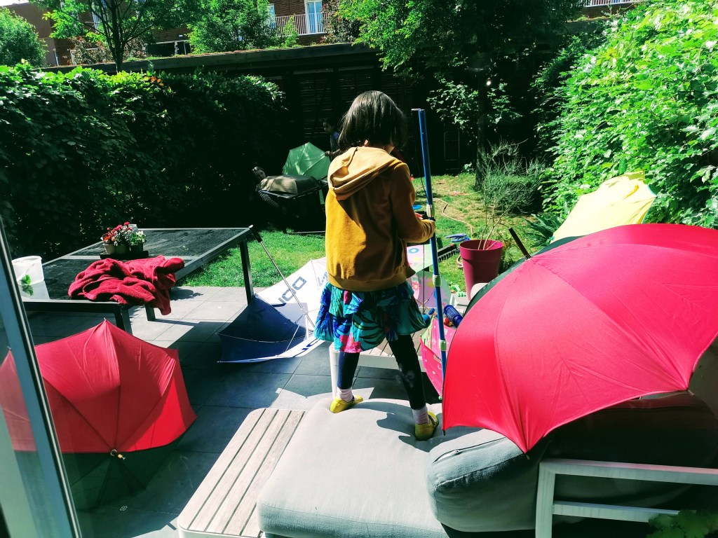 Ook de zussen zijn in hun nopjes nu dat ze bubbel-kameraadjes hebben. Dat daardoor de tuin getransformeerd werd naar …een…ja wat was dat eigenlijk? Een paraplu-kamp?!